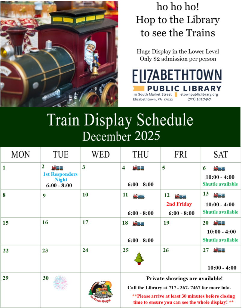 The Holiday Train Display is brought to you by The Train Guys and benefits Elizabethtown Public Library